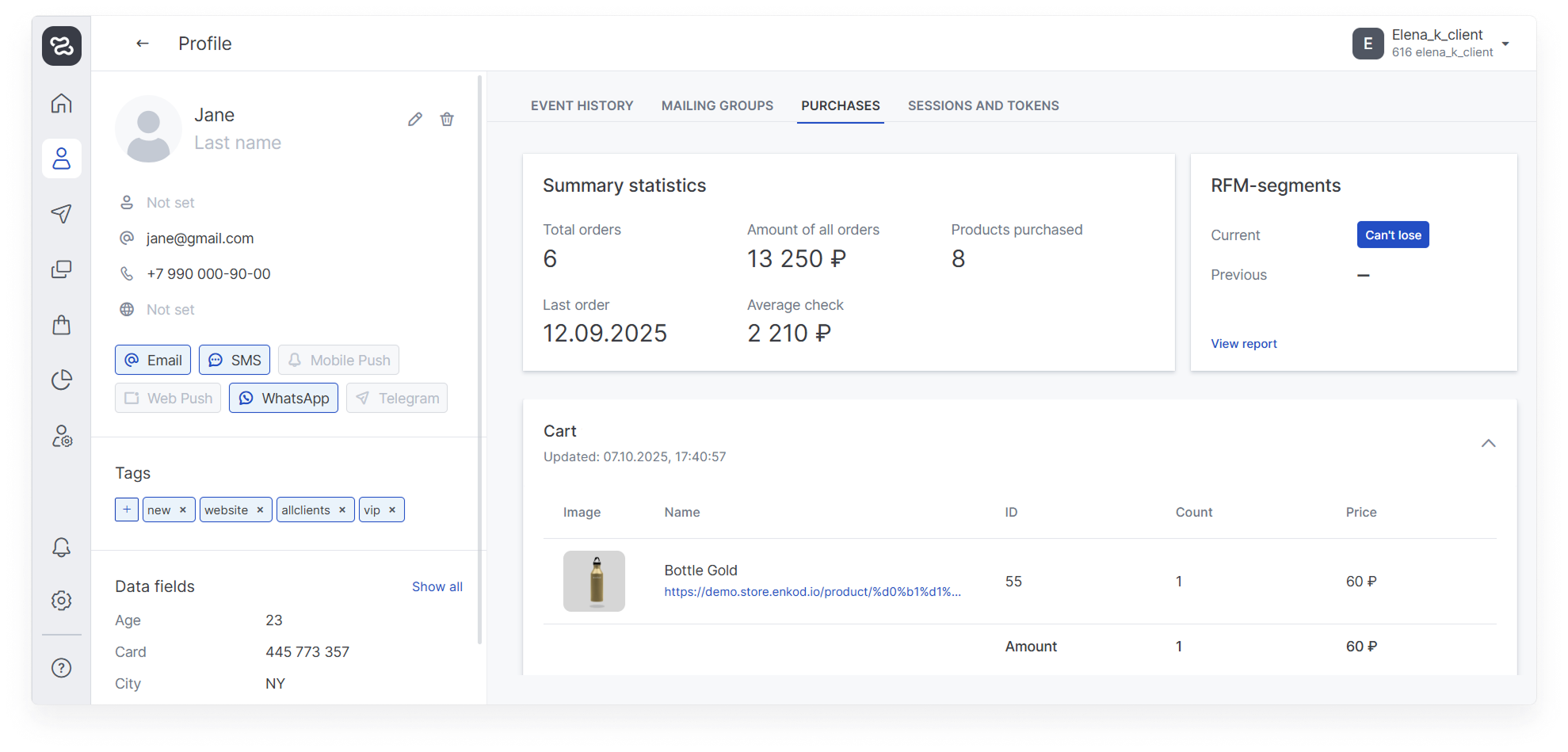 If you click on a contact in the contact list, the contact card (profile) will open. Here you can see all the data known about the user: name, phone number, registration date, traffic source, interaction channels, activity and others.