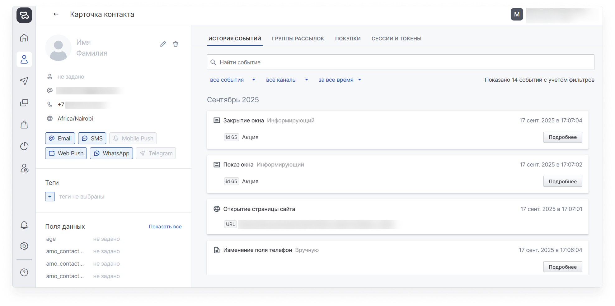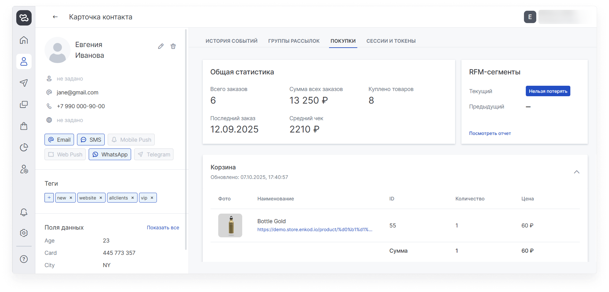Если кликнуть на контакт из списка, откроется карточка контакта. Здесь можно посмотреть все данные, которые известны о пользователе: имя, номер телефона, информацию о покупках, каналы взаимодействия, активность и др.