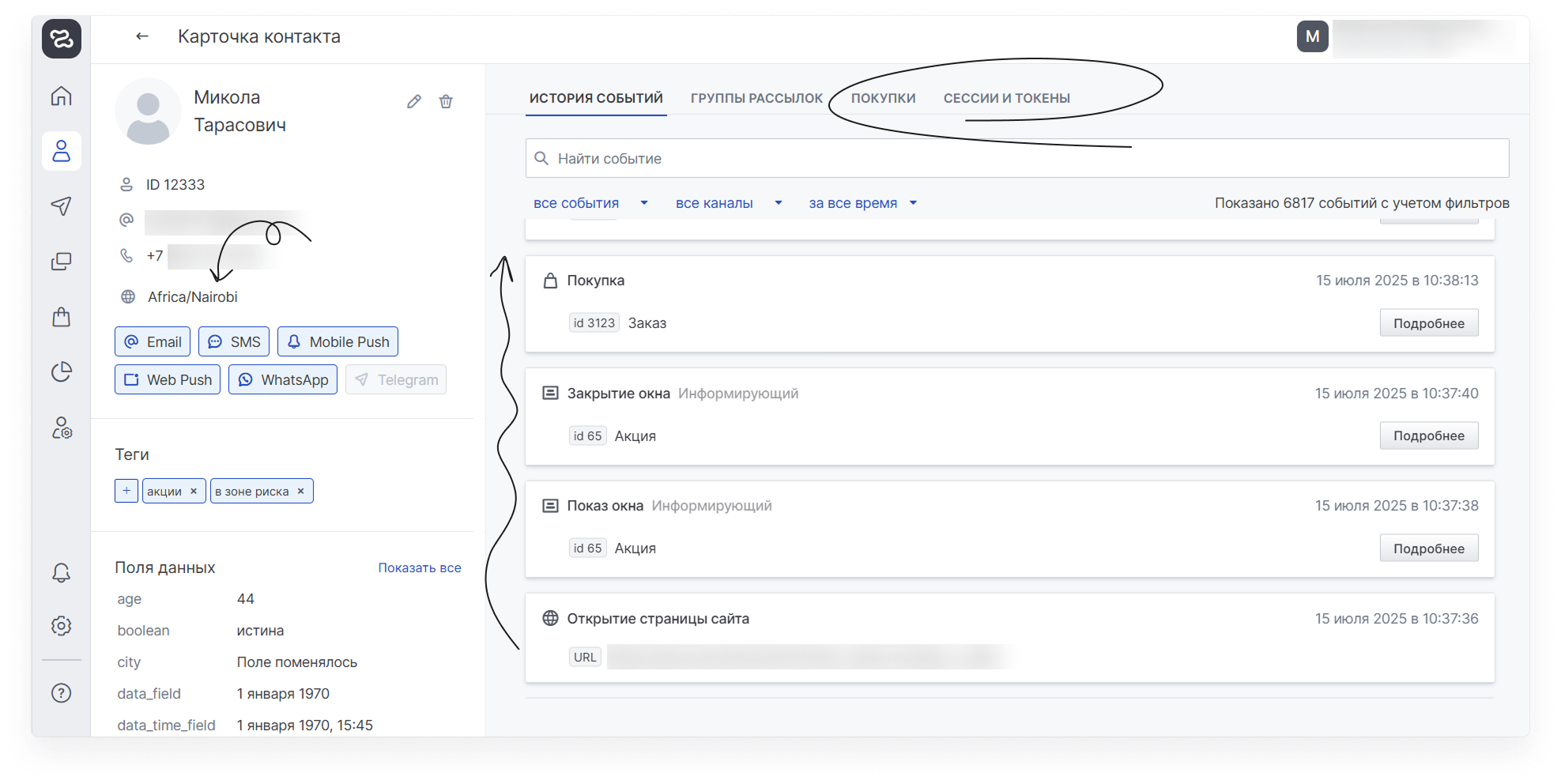 По необходимости вы можете редактировать значения полей данных, email, телефона, имени и фамилии. Обо всех действиях вас оповестят события в карточке, где указано как и кто вносил изменения.