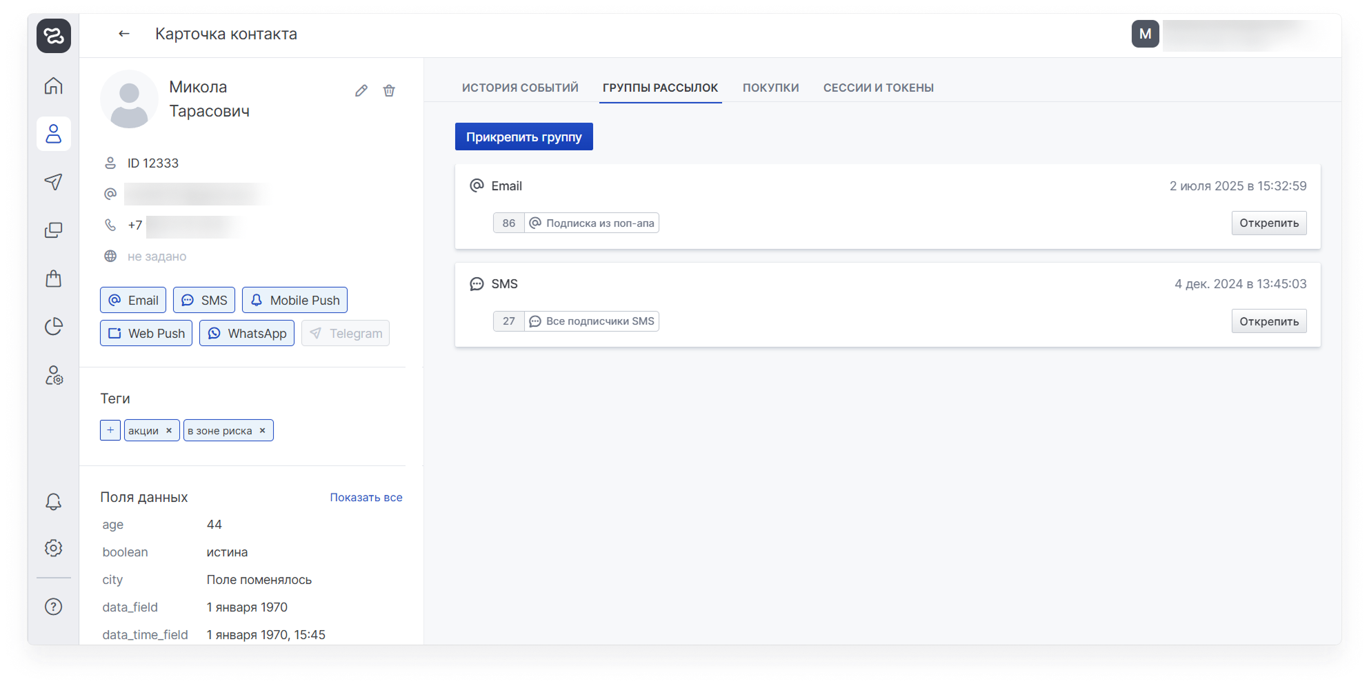 В карточке контакта также можно посмотреть все группы рассылок, которые прикреплены к контакту, открепить ненужные или добавить новые.