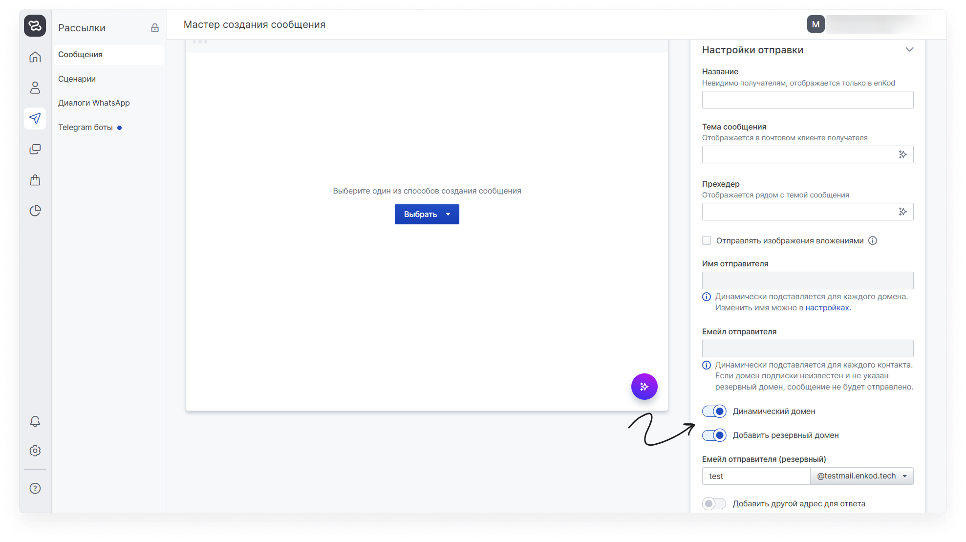 - если сообщение важно отправить в любом случае - воспользуйтесь дополнительной настройкой «Добавить резервный домен». С её помощью можно задать домен отправителя вручную для тех получателей, чей домен подписки неизвестен.