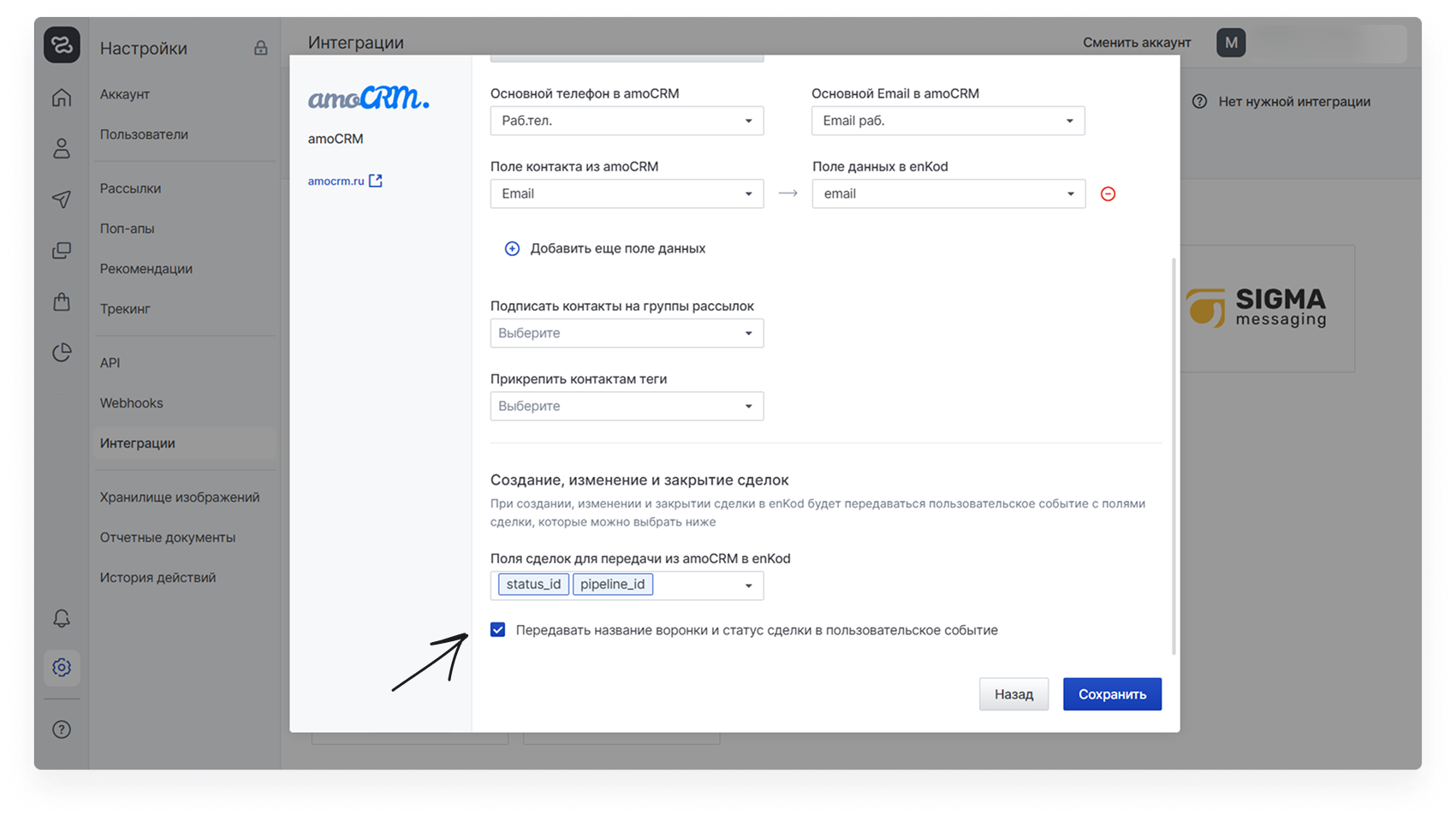 Для того, чтобы отслеживать сделки amoCRM в enKod вам необходимо в соответствующем разделе настроек выбрать поля сделки, которые вы хотите передавать в enKod, и сохранить настройки интеграции.