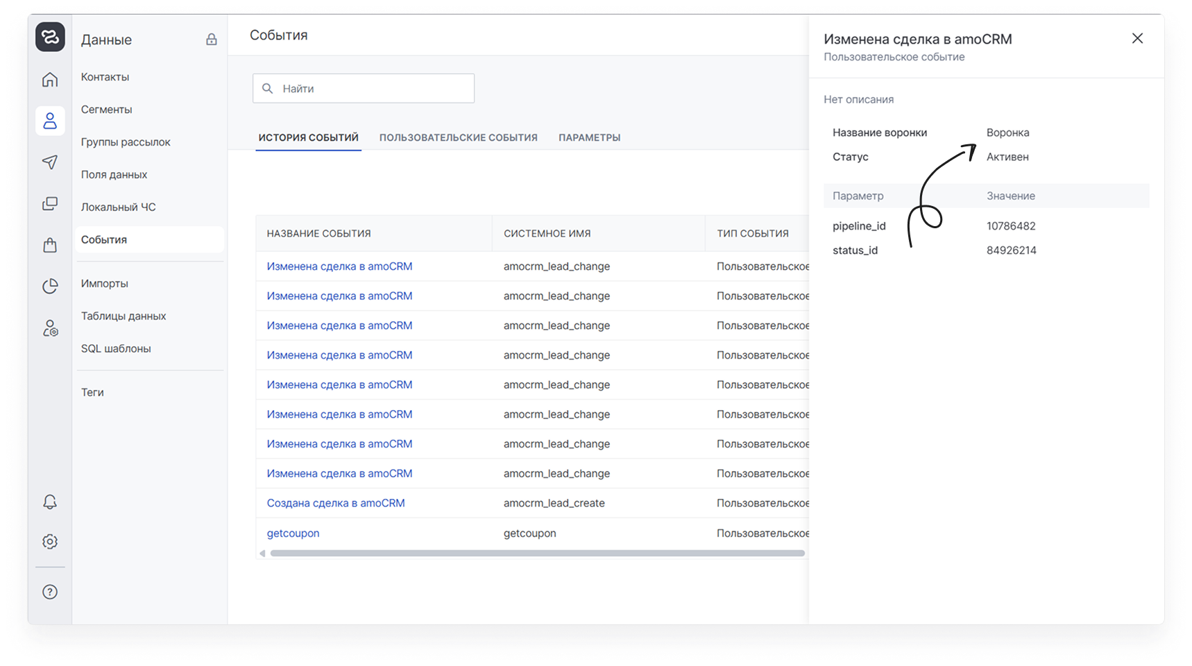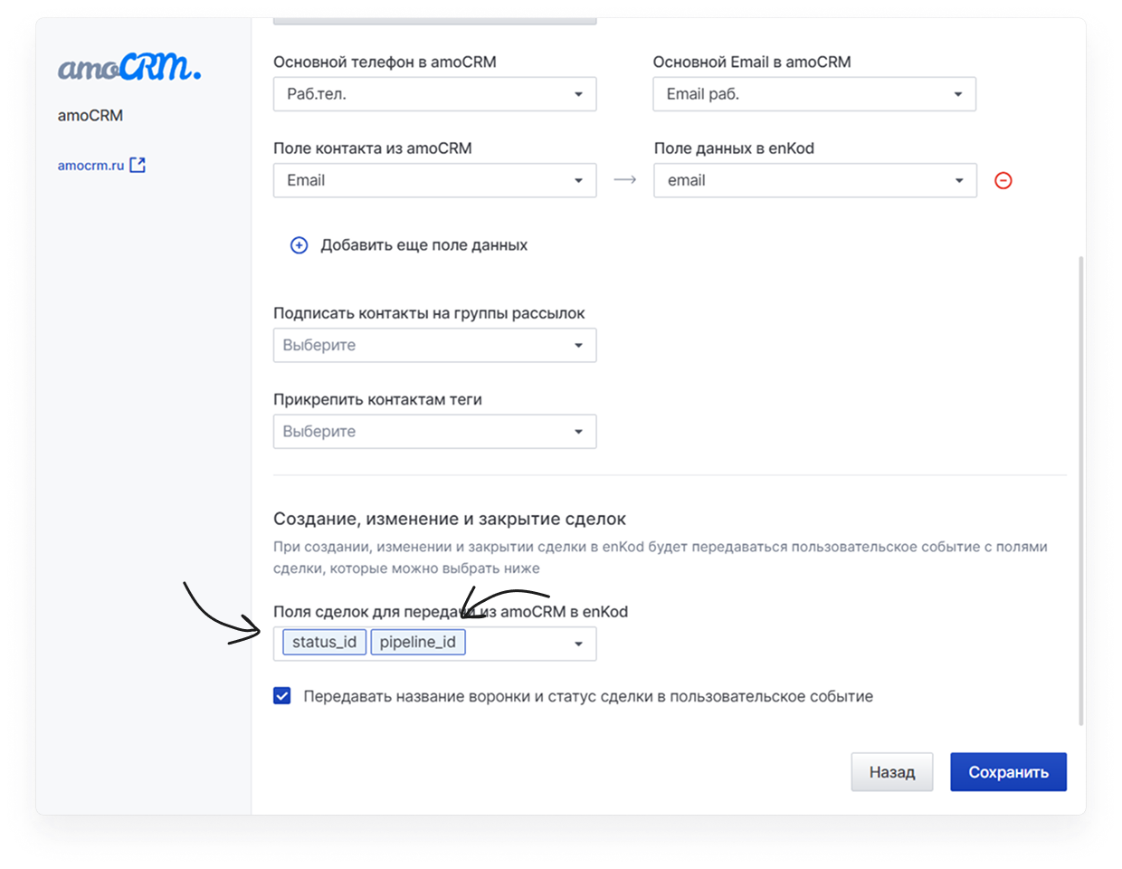 По умолчанию при передаче данных о сделках enKod получает только числовые идентификаторы статуса (status_id) и воронки (pipeline_id). Если вы хотите видеть в истории событий или использовать в сегментации текстовые названия (например, «Сделка заключена» или «Прогрев»), включите дополнительную опцию.