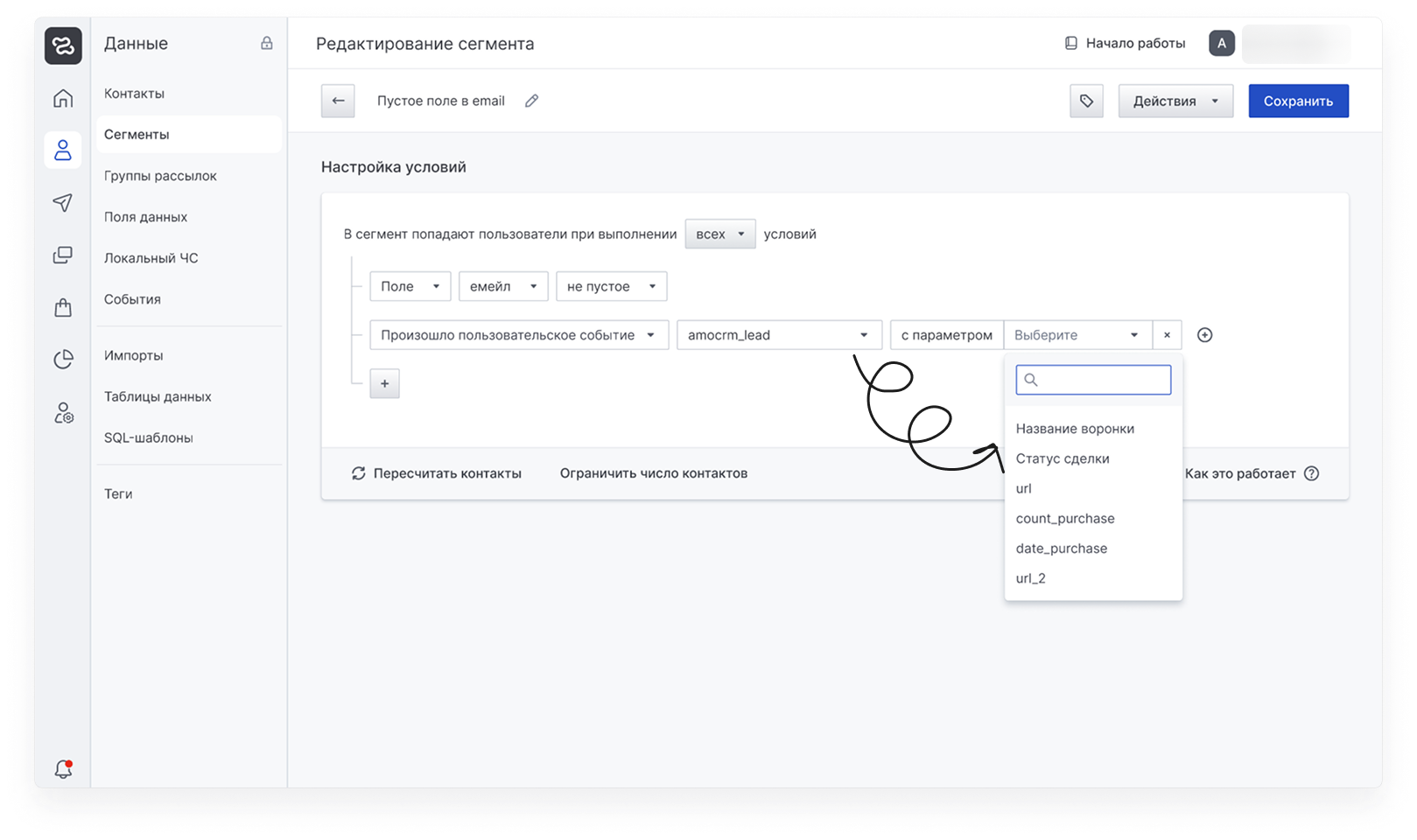 В сегментации при создании сегментов (для рассылок, виджетов, условий) в списке параметров событий amoCRM появляются два новых поля: