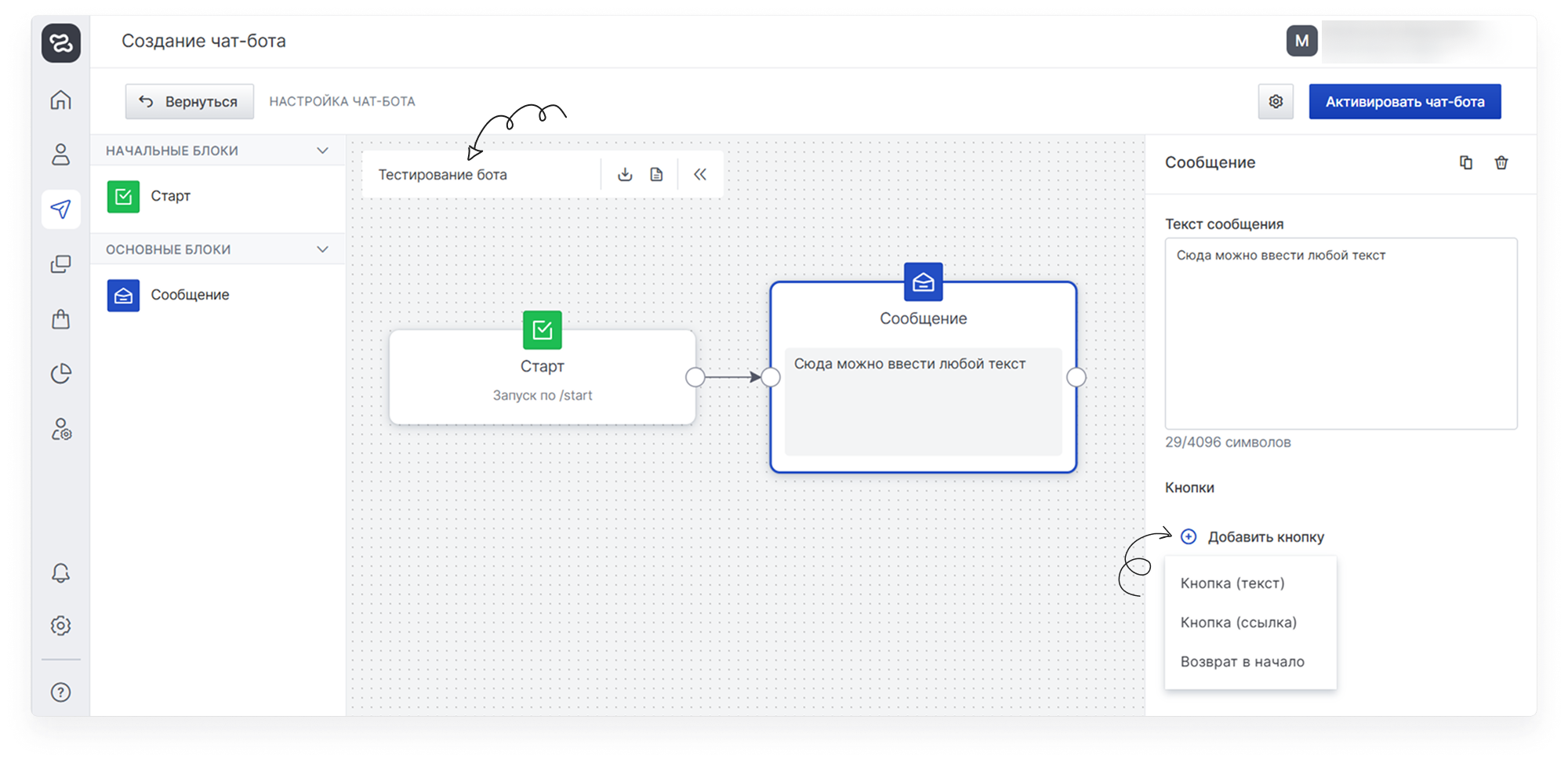 Задайте название (оно будет отображаться только в интерфейсе enKod) и перейдите в редактор бота. Для настройки доступно два блока: старт и сообщение.
